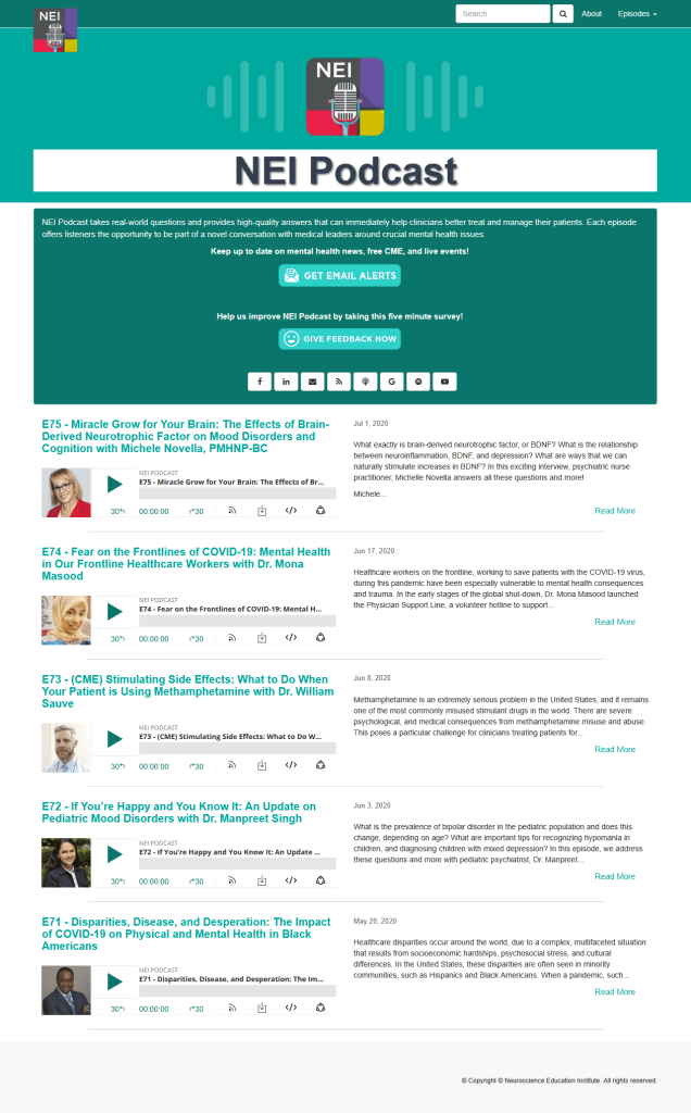 The Mini-Sites offered by Libsyn all have the same layout which is a bit hard to drastically change. Libsyn includes a top header with the site logo on the left, a search bar and a navigation bar with an “About” page and “Episodes” page on the right.