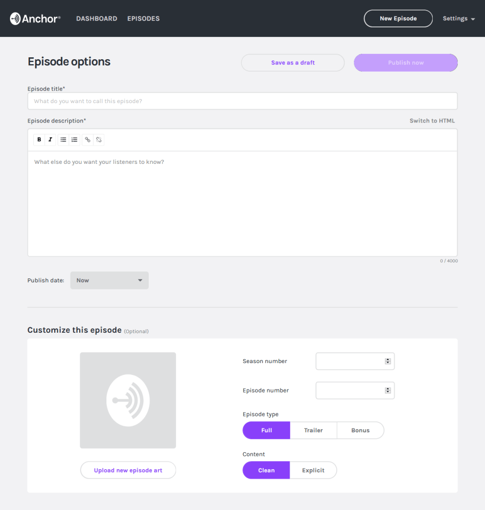 Once you’re done, click on the save episode button. It will take you to the episode settings screen. Here you should add the episode title, episode description, art image, and more. You should also decide if you want to publish the episode now or in a future time.