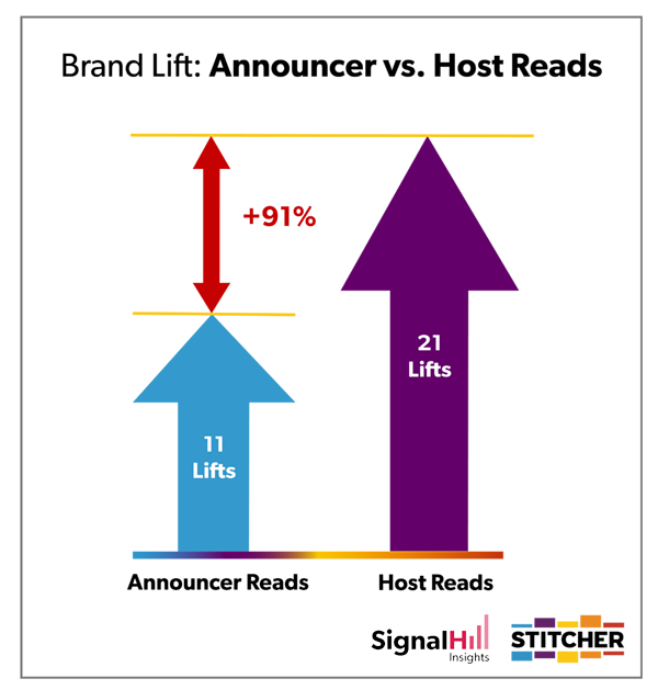 So who actually reads the ad during the podcast? The podcast host can do it or the advertiser (also known as announcer read ads). According to Midroll.com (a podcast advertising network), host-reads generated 91% more than the announcer read ads, for a total of 21 brand lifts. Either way, read by the host or the announcer, it means that respondents that heard the ad showed more awareness of the brand, or a higher intent to purchase than those who were exposed to the same podcast content, but without the ad.