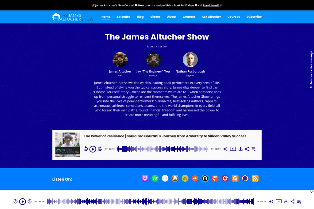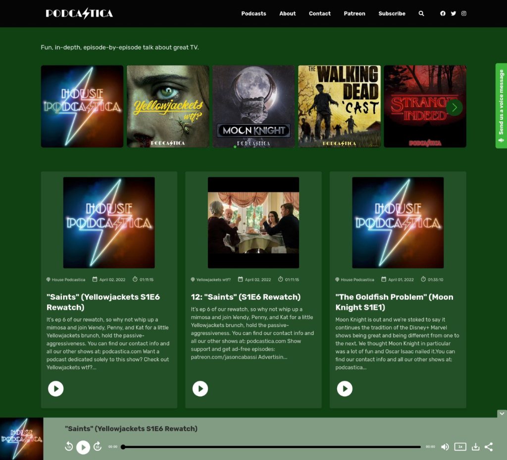 - Individual episode pages include a beautiful audio player + a YouTube embed player.