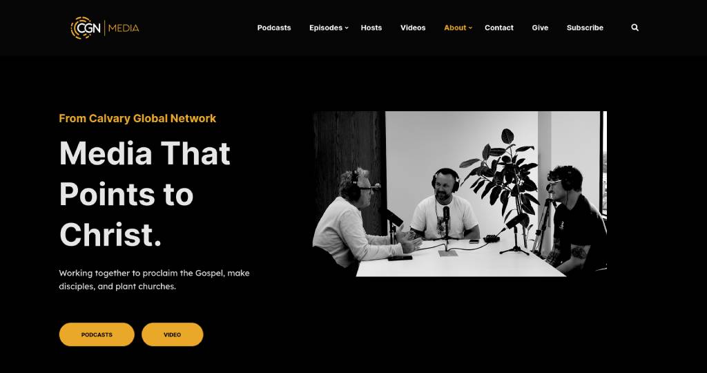- Great hero section with a large heading text, beautiful background image, and artwork of podcasts in the network.
