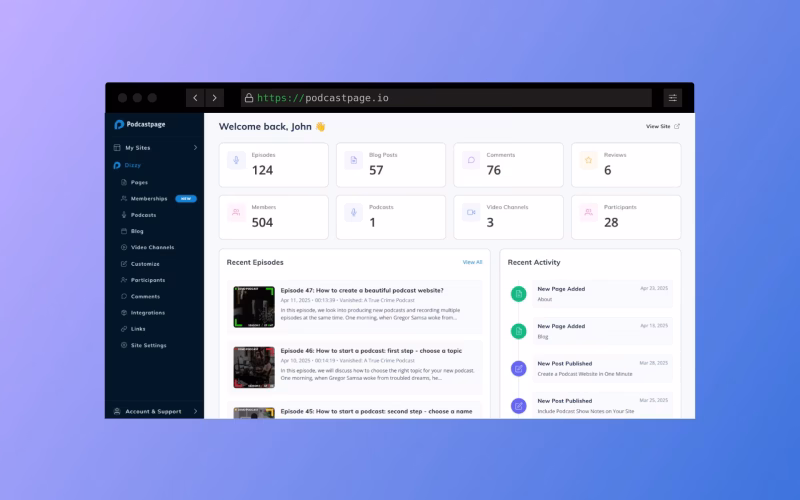 – Recent Activity Feed: Monitor new pages, episodes, posts, participants, comments, reviews, member sign-ups and more – all from one central location.