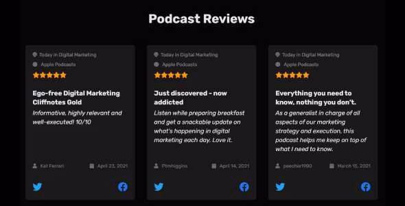 Another important update that is now included on all Beamly plans is to import your podcast’s reviews from Apple Podcasts (iTunes) and Podchaser. We import reviews from multiple iTunes “storefronts”, so you’ll be able to read and feature reviews for your podcast from dozens of different countries.